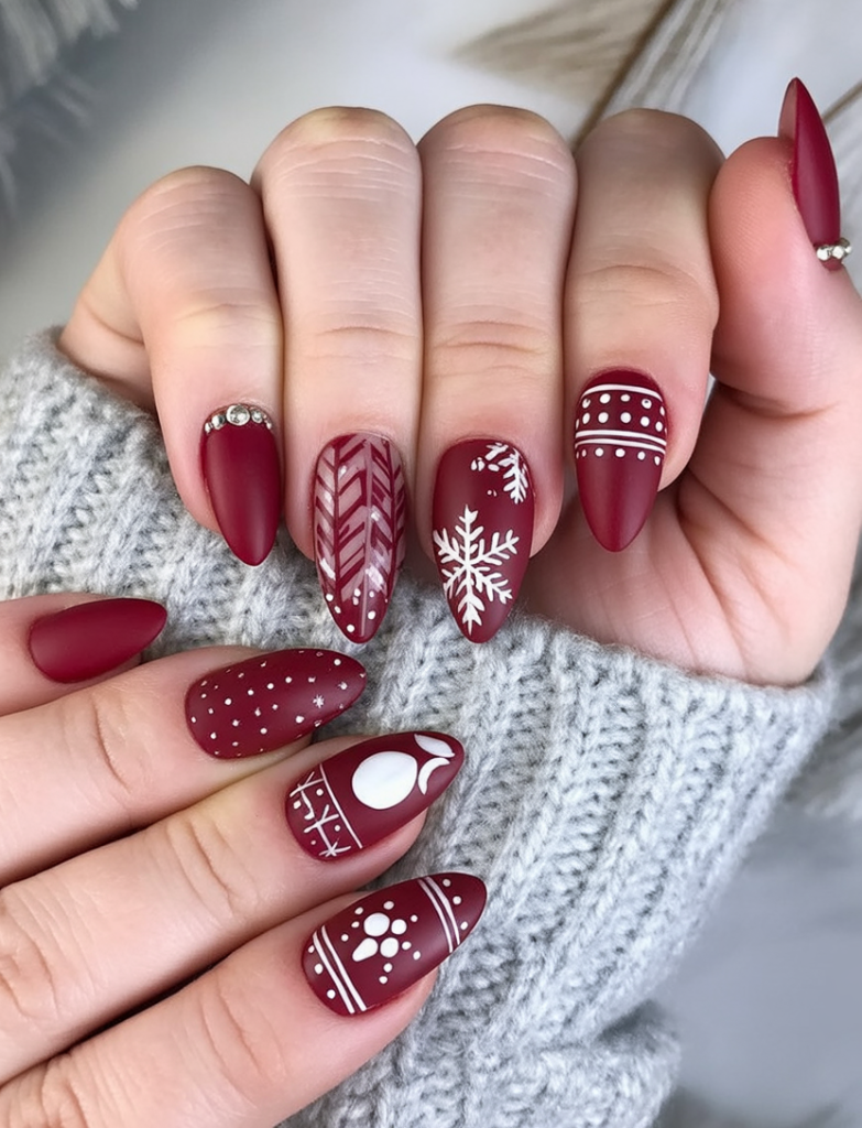 These matte red nails, deep and cozy, shine with playful dotted patterns and dainty white snowflakes. It is like slipping into your favorite holiday sweater, each detail carrying the magic of winter and a little sparkle for Christmas. The cute accents combine with simple shapes to balance this with the festive elegance that 2025 celebrations call for.