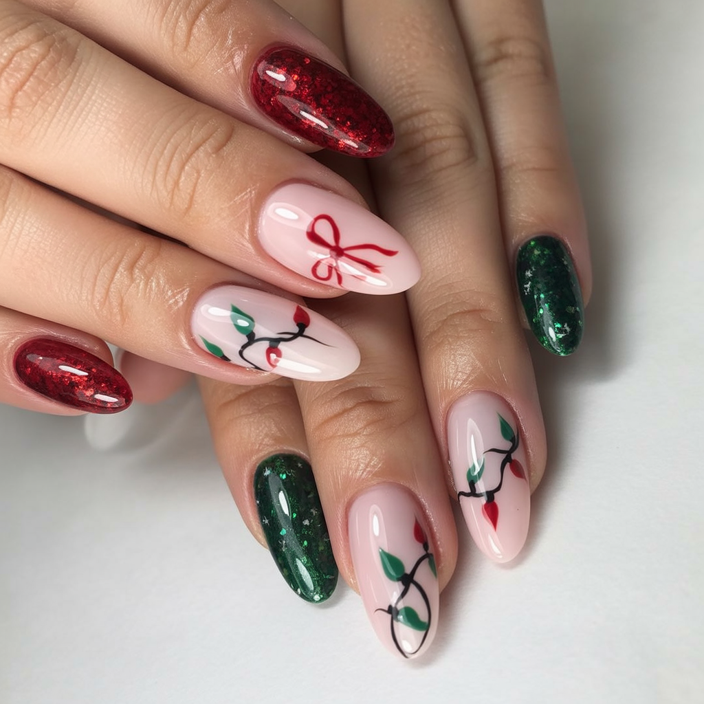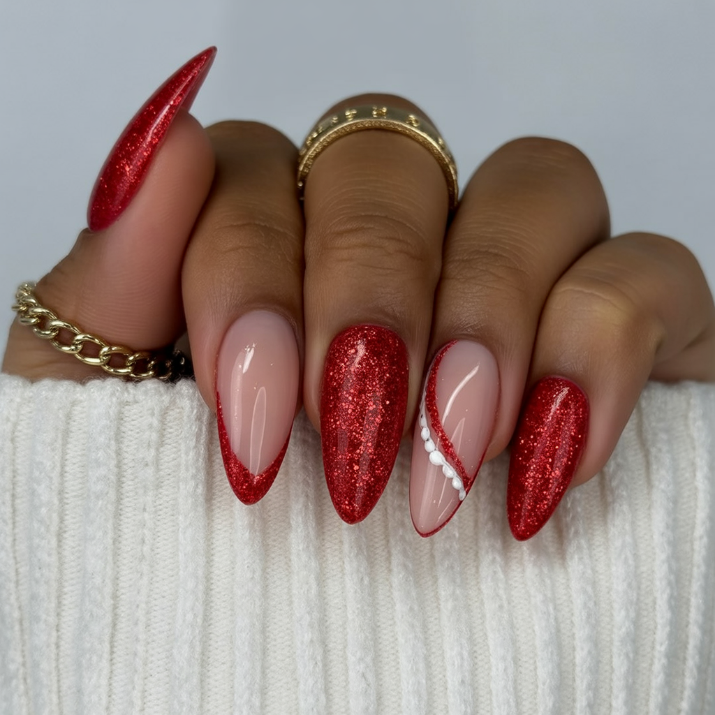 Loads of glitter, bold glamour- rich red glitters against soft nude bases, and pearl-like accents keep these nails very balanced between high-energy festivity and refined uber-minimalism. Be it attending a Xmas party or managing a dull day that sparkles away with your pace-sure these nails will breathe in your confident celebratory air with such ease.