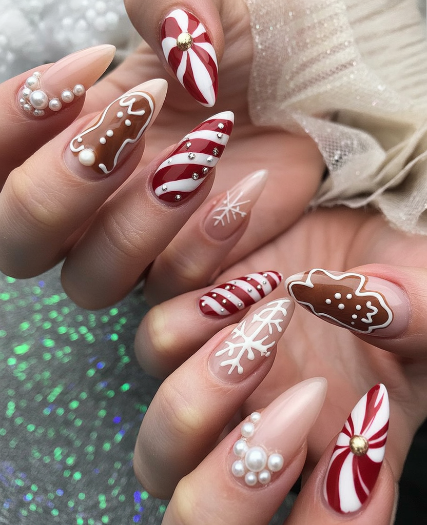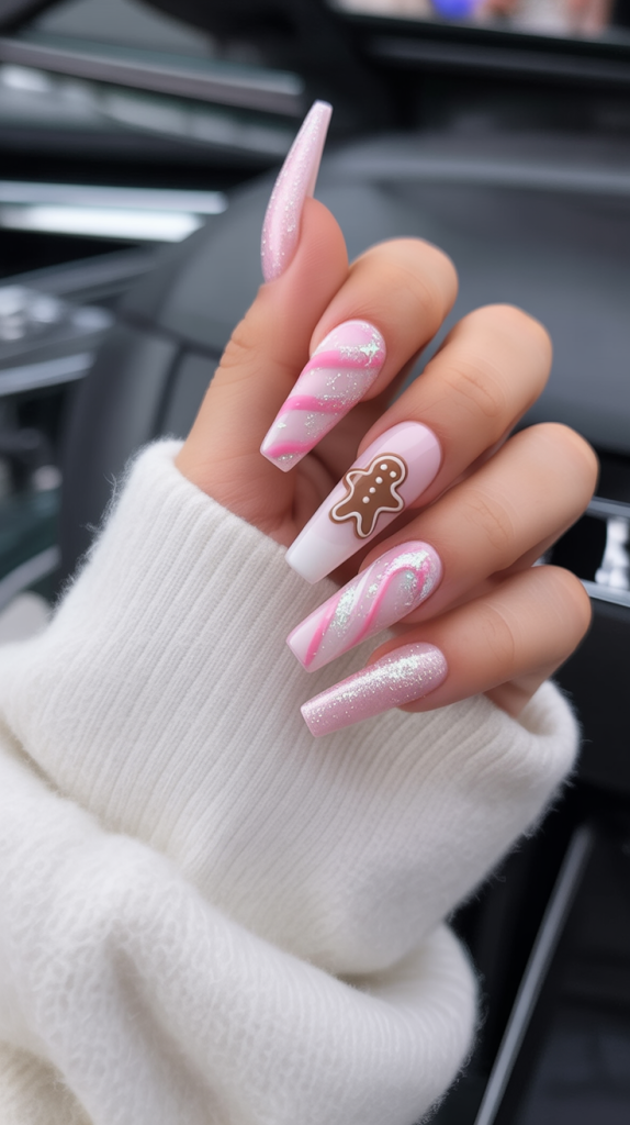 11. Pink Candy Canes and Gingerbread Xmas Nails