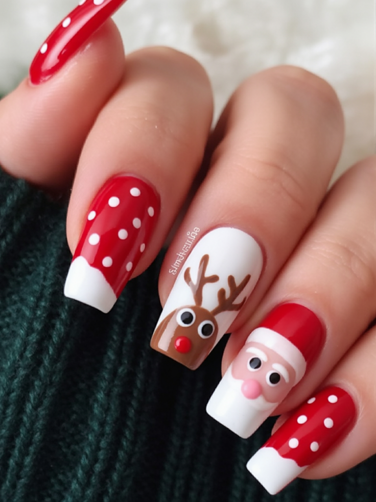 The nails tell the story right at your fingertips: cheerful red polish with snowy polka dots, cute reindeer faces, and Santa himself. The design is nostalgic and fun-a few moments away from those holiday movies or baking cookies on a winter night. It’s playful, bold, and will put a smile on anybody’s face-well, truly cute embodiment of the heart of Xmas spirit.