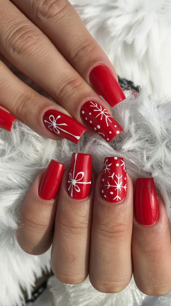 This design whisks the know-how’s of red-and-white polish into the realm of winter wonderland with bold snowflakes and festive bows. The juxtaposition of solid backgrounds against the detailed design fosters a lively set that feels cozy yet glamorous. It is the perfect selection if you want your nails to reflect the season without sacrificing elegance.