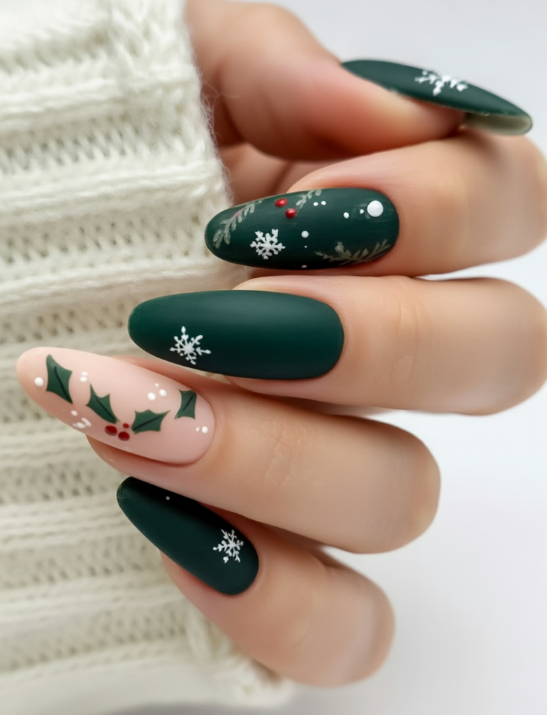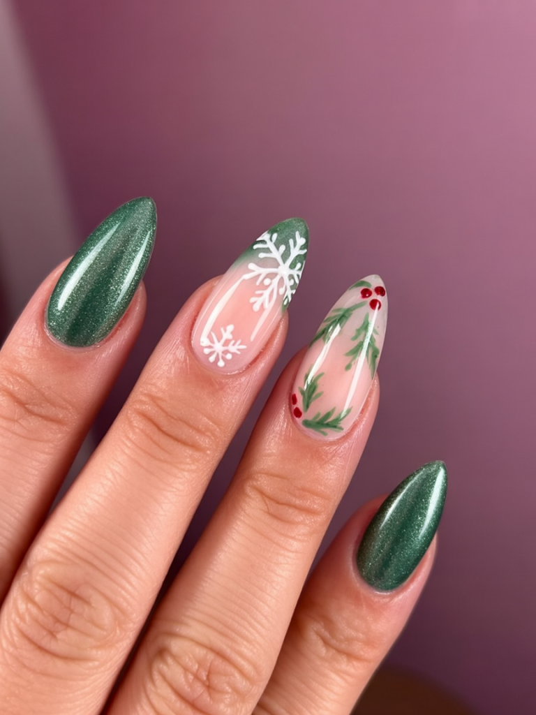 Fresh yet elegant, these nails pair sparkling green polish with delicate holly accents and a striking snowflake design. There is a subtle contrast between the silhouette and filled forms of the snowflake design. The combination feels festive yet graceful, like decorating the tree with sparkling ornaments. It’s a look that balances cute holiday motifs with grown-up sophistication, perfect for embracing the spirit of Christmas nail art designs 2025.