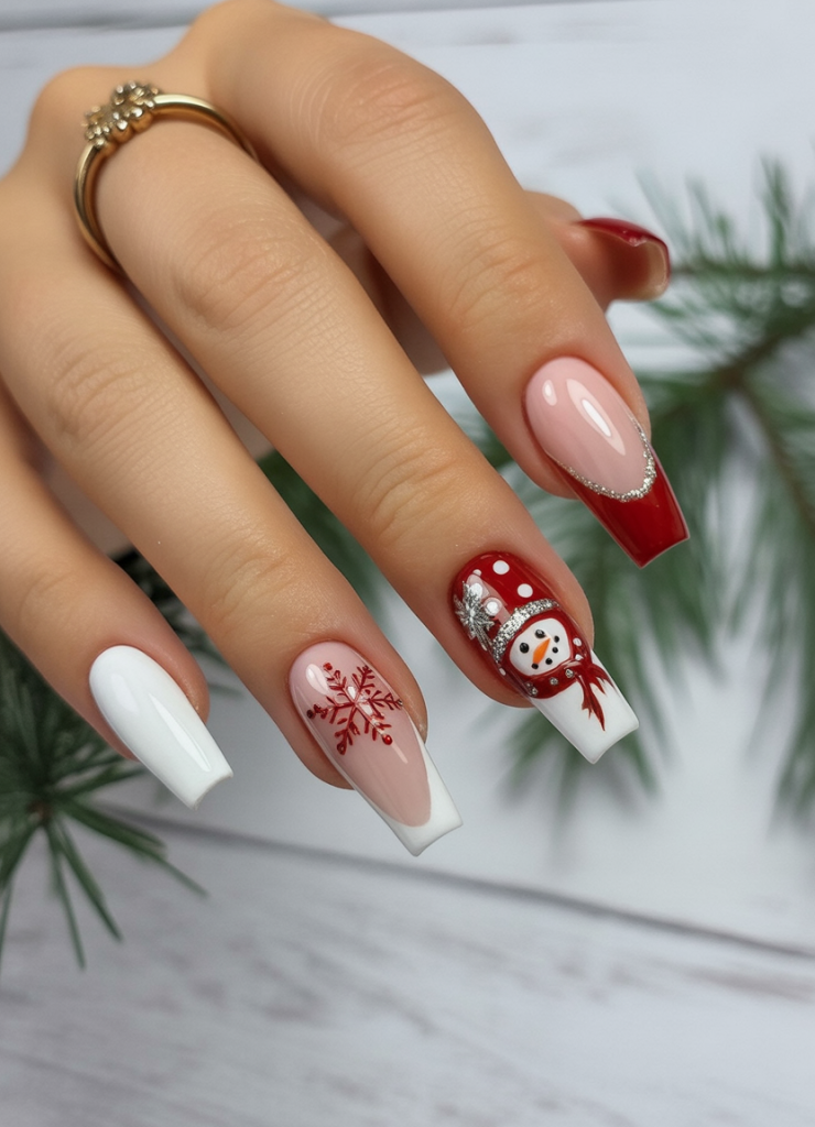 These nails celebrate all colors and classics with red French tips, a sparkly snowman accent, and snowflake details in white. The look is playful-yet-not-over-the-top and perfect for anyone beauty who wants nails that read festive-yet-wearable. This sort of nail set is what instantly spreads a smile and embraces the joy of winter frolicking.