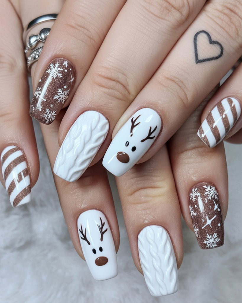 Warm and inviting, these nails combine cable-knit textures with reindeer accents and snowflake designs. Brown and white mix gives a warm hot chocolate feel-good ambiance-a truly perfect winter treat. Not just cute-they really melt your heart into that nostalgic warmth of sitting by the fire in your favored sweater. This holiday season, a nice shout-out was given to both looks and comfort.