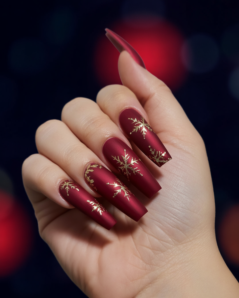 These nails are luxurious and bold, with matte burgundy polish embellished with golden snowflakes. The mingling of shades looks regal and festive, fitting for an evening fete. Elegant yet firmly seasonal, they bring a refreshingly modern take on Christmas nail art design 2025, stylish, timeless, and thoroughly captivating.