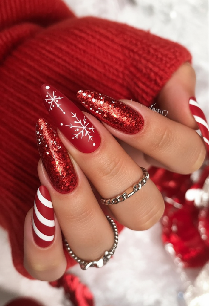 Glittery and bold nails display the very essence of celebration, the red glitter providing shining starry Christmas magic with hand-painted snowflakes, and strips of candy canes adding subtle vibes. The cracking glitter effect is such a sparkling red glitter vibe on its own, while the fun stripes lend a cute and playful aspect to the whole look. They equally exude warmth, fun, and the unmistakably festive energy of winter evenings.