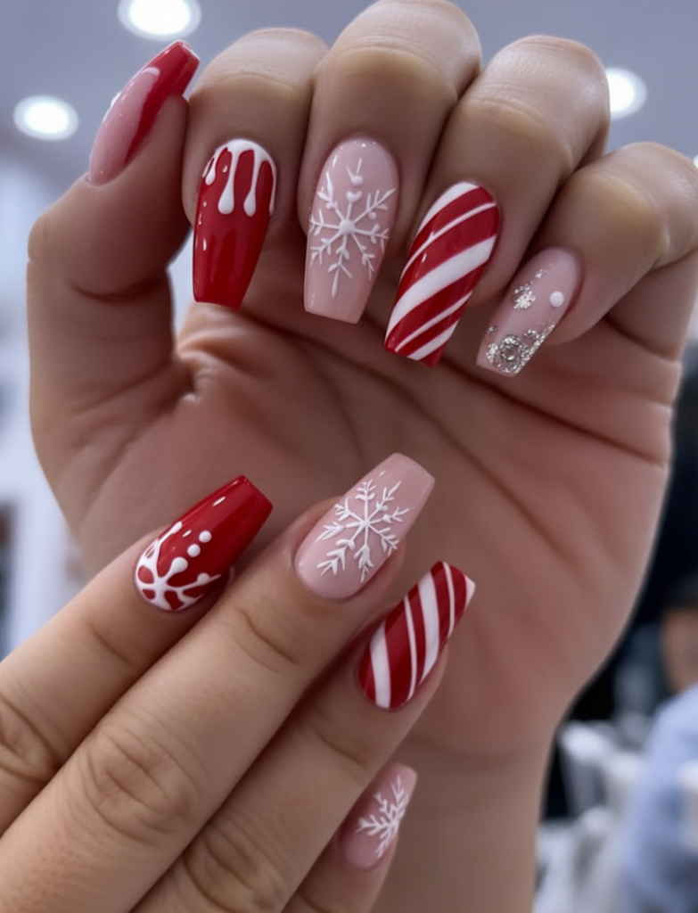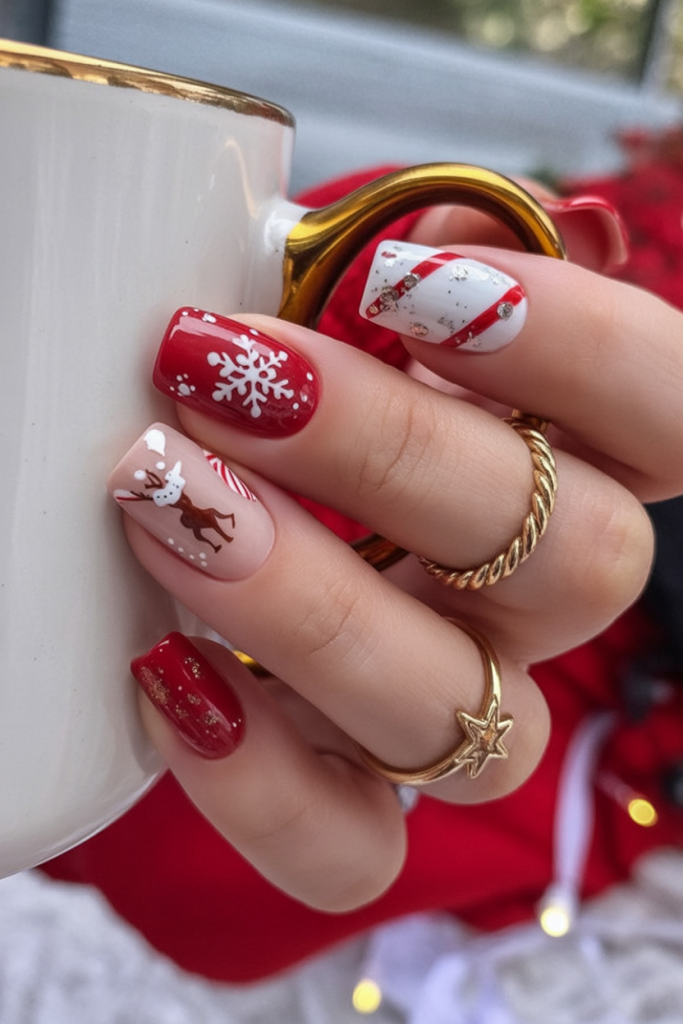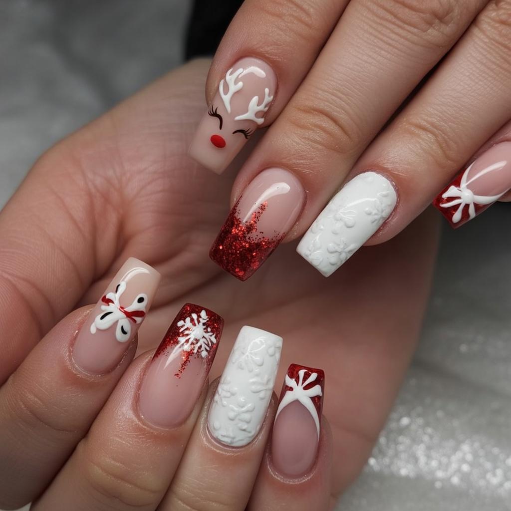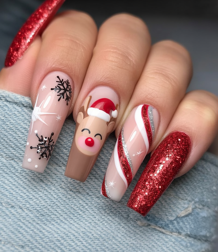 Full of personality and charm, these nails feature a smiling reindeer in a Santa hat, glittering candy cane stripes, and pops of red sparkle. The mixture of glitters, snowflakes, and character art turns this design into a little holiday story told through nail art. It is whimsical, joyful, and meant for anyone who adores Christmas details with a bit of bold sparkle.
