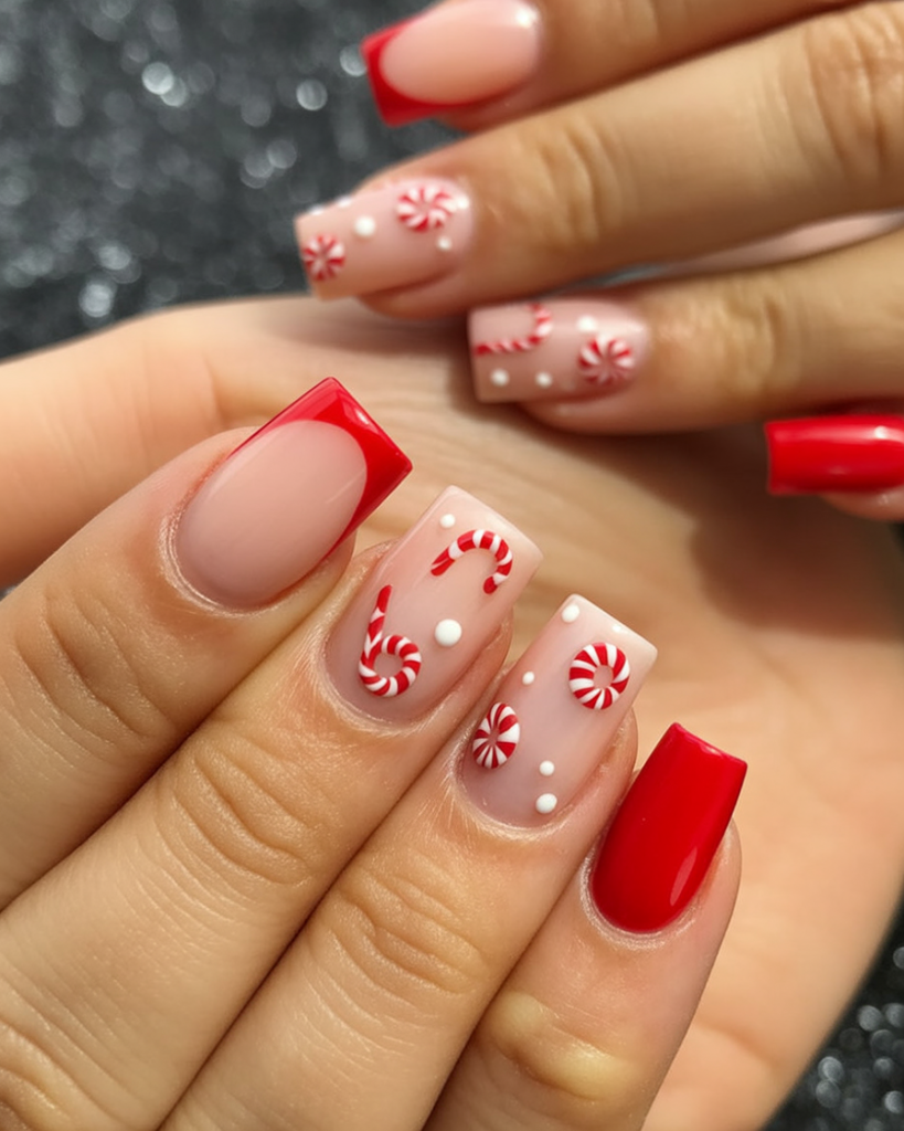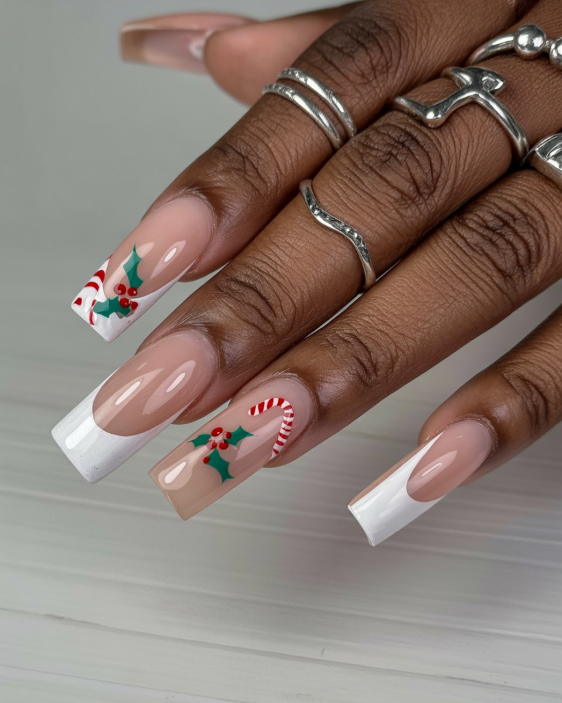Chic yet playful nails that join classic French tips with festive holly leaves and candy cane accents. The nude base keeps everything crisp and modern, while the touches of green and red shout unmistakable holiday charm. It’s fresh and cute-perfect for anyone who enjoys seasonal accents but doesn’t want to go full sparkle.