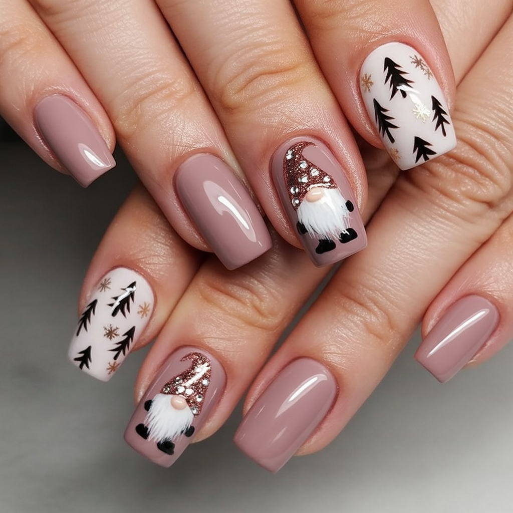 Unique and whimsical, these nails feature little gnomes with sparkling hats, surrounded by delicate tree and snowflake designs. The muted taupe base keeps the look chic, while the details add playful charm. It’s a delightful twist on Christmas nail art designs 2025, blending a cozy winter theme with unexpected personality.