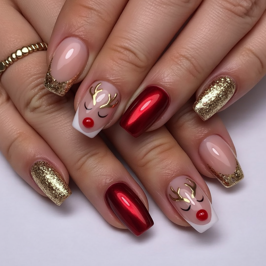 With the adorable reindeer accents, glittering gold tips, and deep metallic red polish, these nails bring storybook charm to your fingertips: the perfect fusion between whimsical and glamorous, setting the festive mood that feels like entering a winter wonderland. The Rudolph-inspired design is playful yet chic – a conversation starter at any Xmas party.