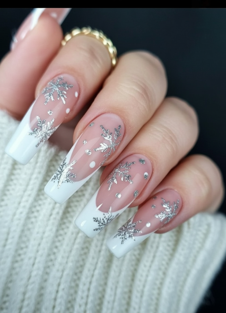 Tender yet dreamy, these nails have taken the French tips and embellished them with winter silver glitter snowflakes. The nude base contrasts with the white and silver design, lending an elegant-ass-yet-seasonal touch. They give the impression of frostiness-fresh-festiveness-just as if you were catching snowflakes on your mittens during some brisk holiday evening. Truly, the much-needed nod to both traditions and trends of the year 2025.