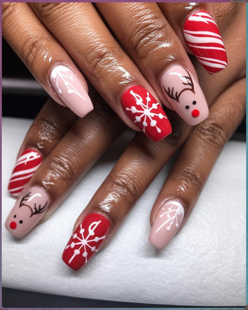 5. Fun Reindeer and Snowflake Red Christmas Nails