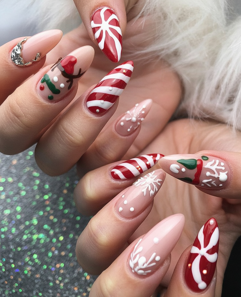 1. Playful Christmas Candy Cane and Reindeer Nails