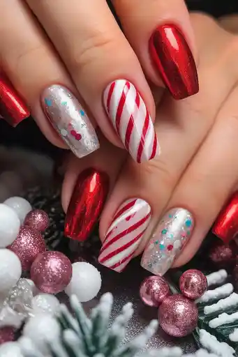10. Shiny Red and Silver Candy Cane Christmas Nails