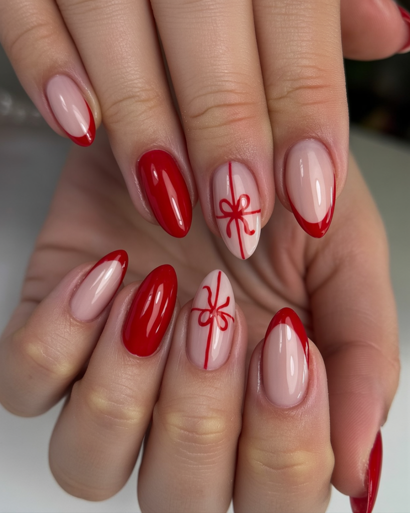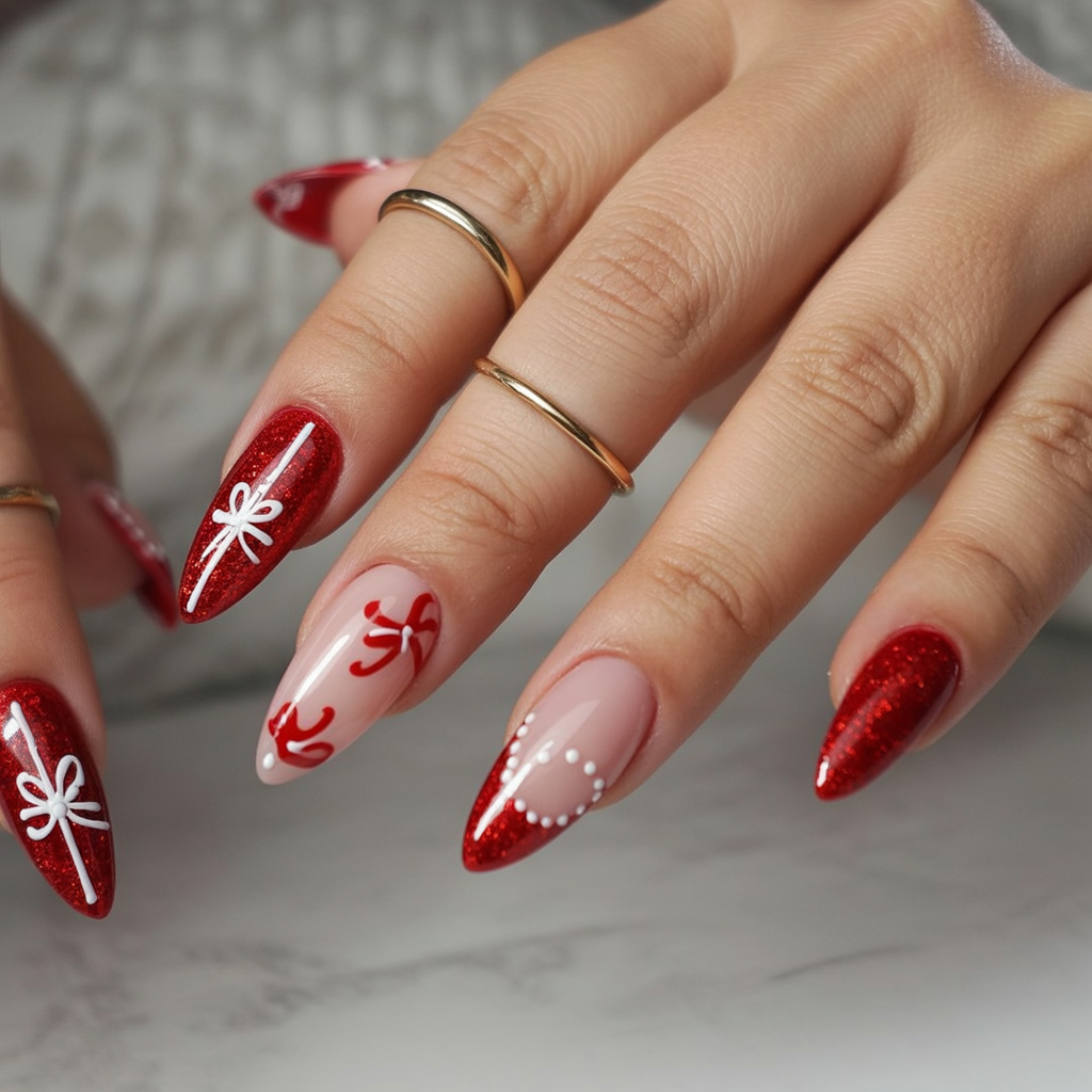This style fits almond-shaped nails and suits women who prefer neat, polished designs for a bit of festivity. The glossy gel keeps the shine on for duration while the simple combination of red and nude enables one to complement their finest holiday attire.