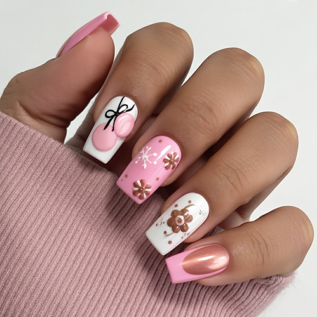 The look fits a woman who enjoys any variation from the standard red and green. The square or coffin shapes give them a lovely stage for the details, and the pink base keeps it fresh and youthful. It is a joyous, easy design to accompany your cozy sweater or pastel holiday outfit.