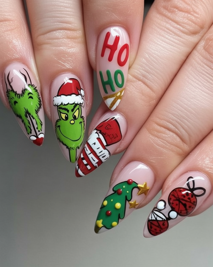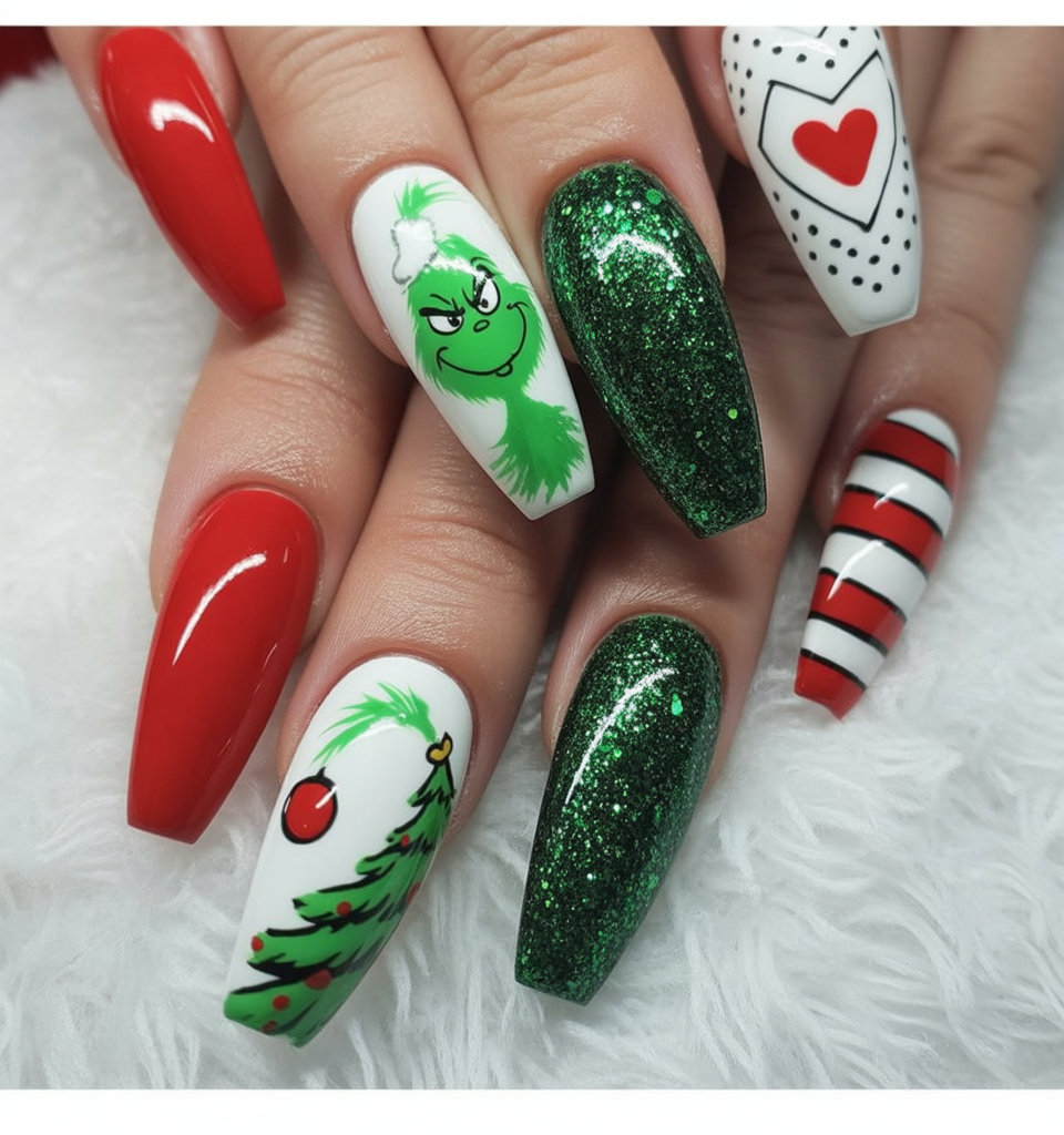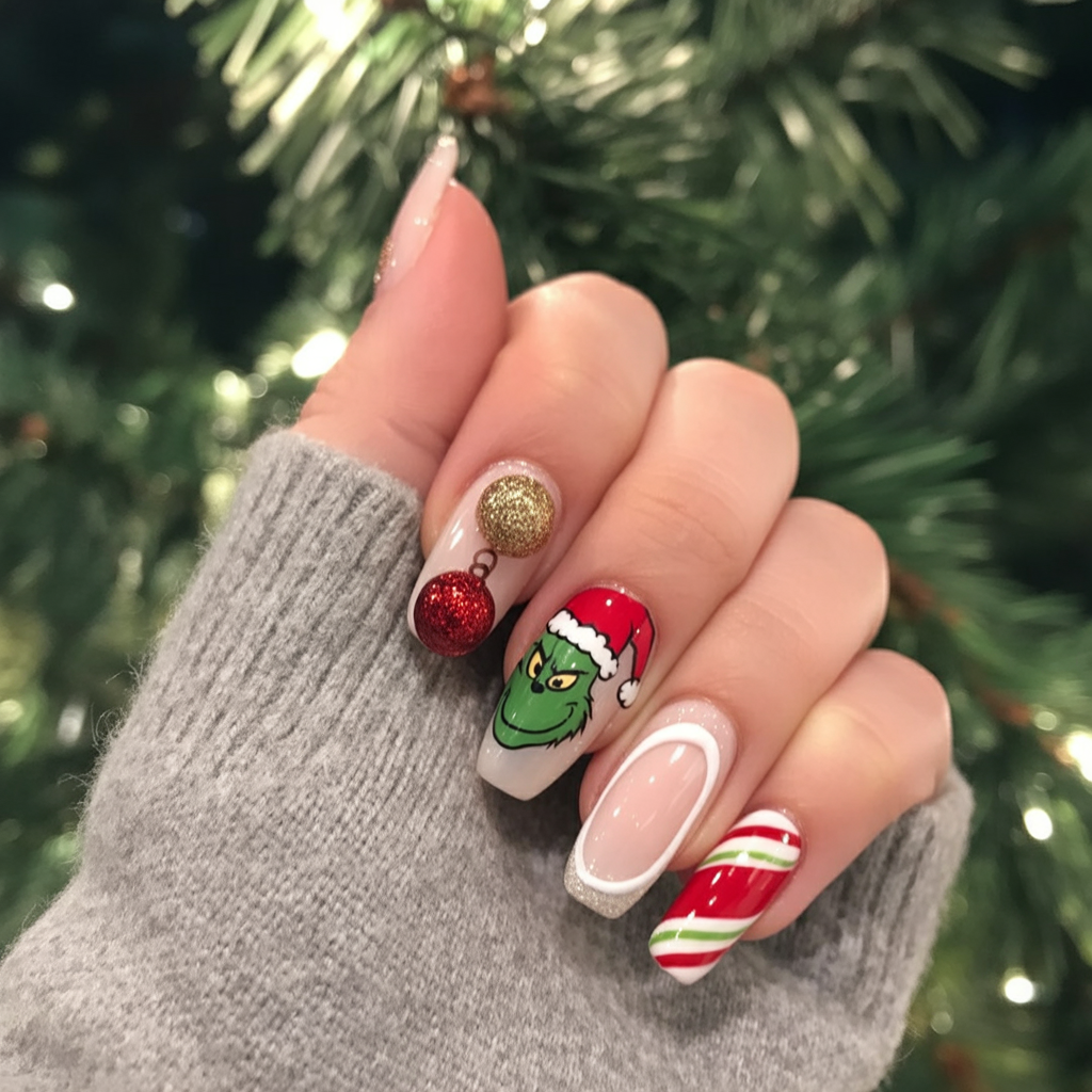 The nails put holiday humor front and center, featuring a mischievous Grinch face, glittering ornaments, and candy cane stripes. Contrasting reds, greens, golds, and whites instantly evoke Christmas while cartoonish details add a cheeky twist. It is bold, eye-catching, and sure to spark many wonderful conversations throughout the season.