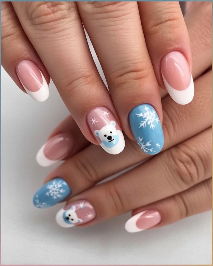 This manicure is soft and whimsical, with pastel blue polish, delicate white snowflakes, and adorable little polar bear accents. Coupled with French tips, it is playful-yet-elegant-winter-wonderland style that preserves the enchantment of a snowy Christmas morning. The entire scenario feels warm and joyful, like sporting your favorite ugly Christmas sweater.