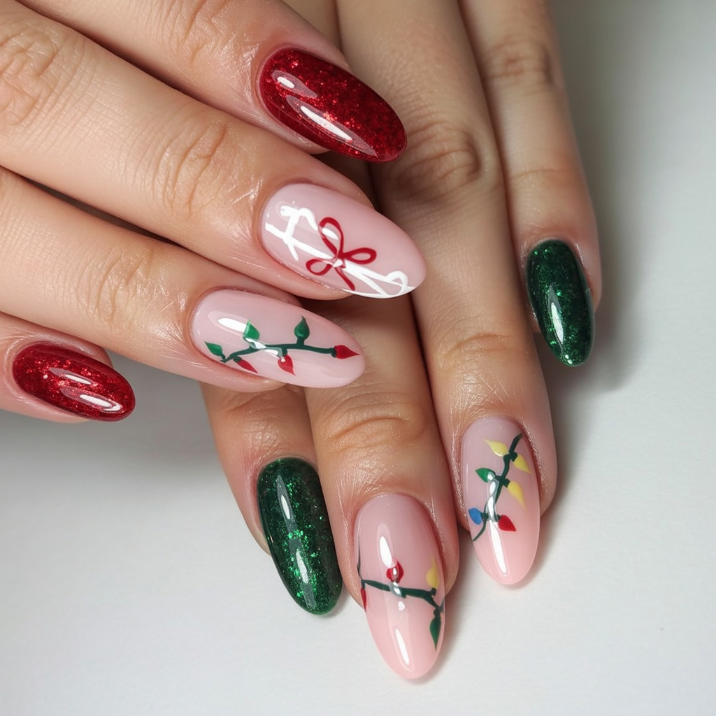 Nothing says holiday cheer quite like Christmas lights, and this manicure brings them to life. Glittery red and green nails are paired with delicate string-light designs, complete with colorful bulbs that look ready to twinkle. A sweet bow accent ties the look together, making this set both whimsical and stylish.