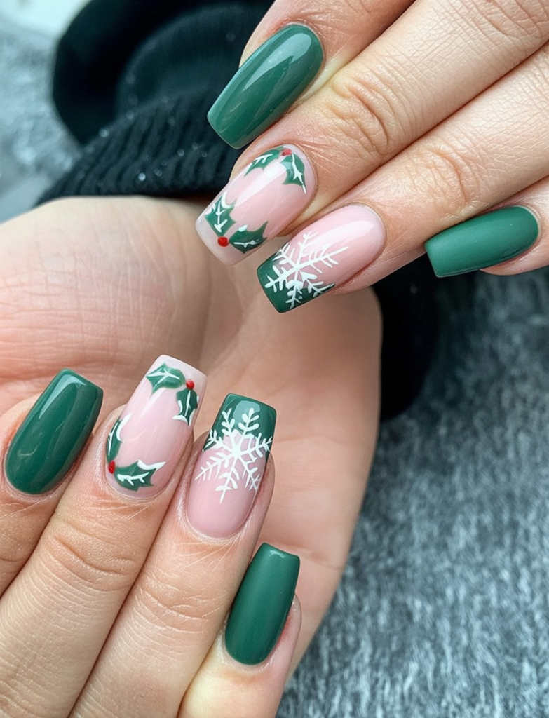 18. Elegant Green Holly and Snowflake Christmas Nails