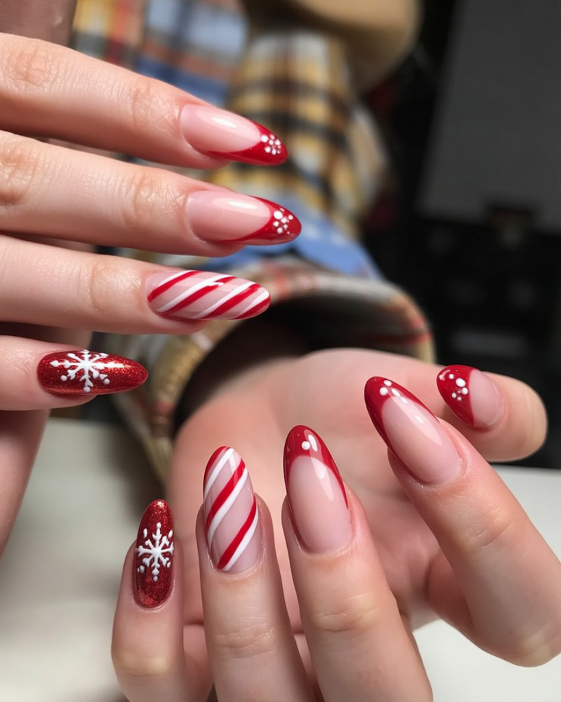 These nails instantly put you in the holiday spirit with their joyful mix of red and white candy cane stripes, snowflakes, and a cute reindeer accent. There’s a playful energy here that feels both festive and youthful, like unwrapping gifts under twinkling lights. The combination of bold patterns and soft nude base makes them eye-catching without being overwhelming, perfect for women who want their manicure to spark conversation during holiday gatherings.