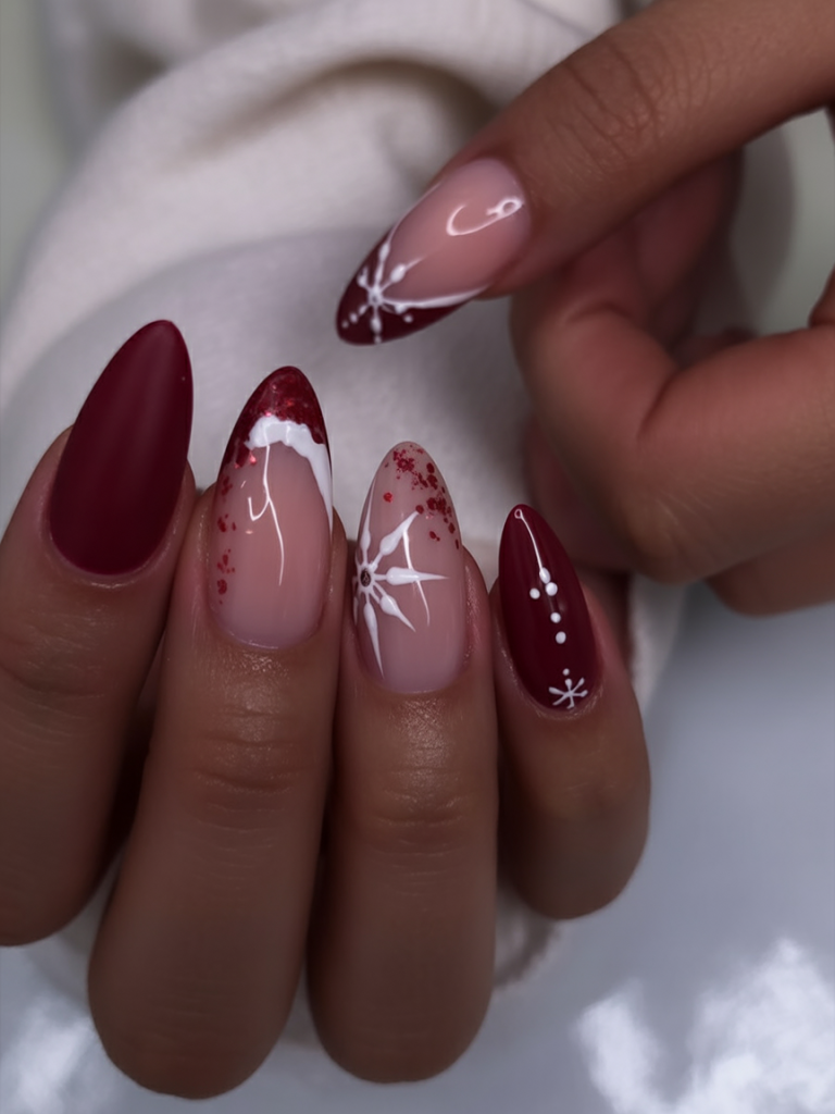 Burgundy nails have their own charm when paired with fine and delicate white snowflakes. This design brings elegance to the holiday time-a deep rich tone for those cozy evenings, accented with crisp designs that glisten with the charm of winter. Being a bit of a classic-nurturing femininity, it feels rather holiday-chic without the effort.