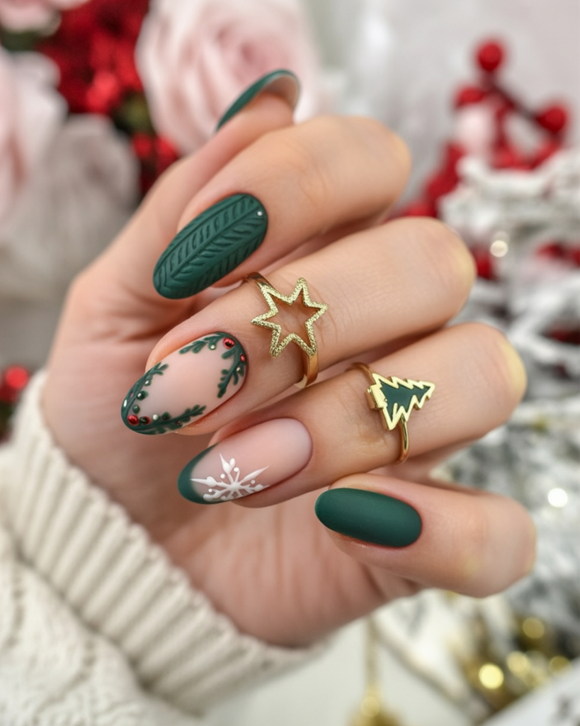 Matte green nails with wreath accents and delicate snowflake art keep this manicure festive yet sophisticated; the texture of the leaves lends depth to the design, while the nude base accentuates that white color without overpowering and keeps everything light and balanced. Creative, stylish, and bursting with festive spirit, it quite rightly claims to be the trendy nail look of the season.