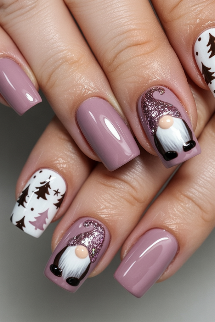 Whimsical and cozy, this design pairs adorable gnome figures with snowy winter trees and soft mauve polish. Glittery details add a festive sparkle, while the neutral base keeps the overall look chic and wearable. It’s a manicure that feels lighthearted and warm, like curling up with a holiday movie on a cold night.
