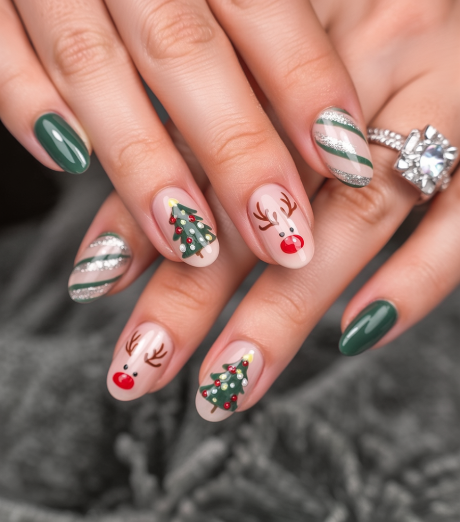 Cheerful and charming, this manicure features miniature reindeer faces, glittering Christmas trees, and candy cane stripes. The playful red noses and glittery green accents inject a ton of holiday cheer, balanced by the clean nude base. It is a very happy design that is full of Christmas spirit.