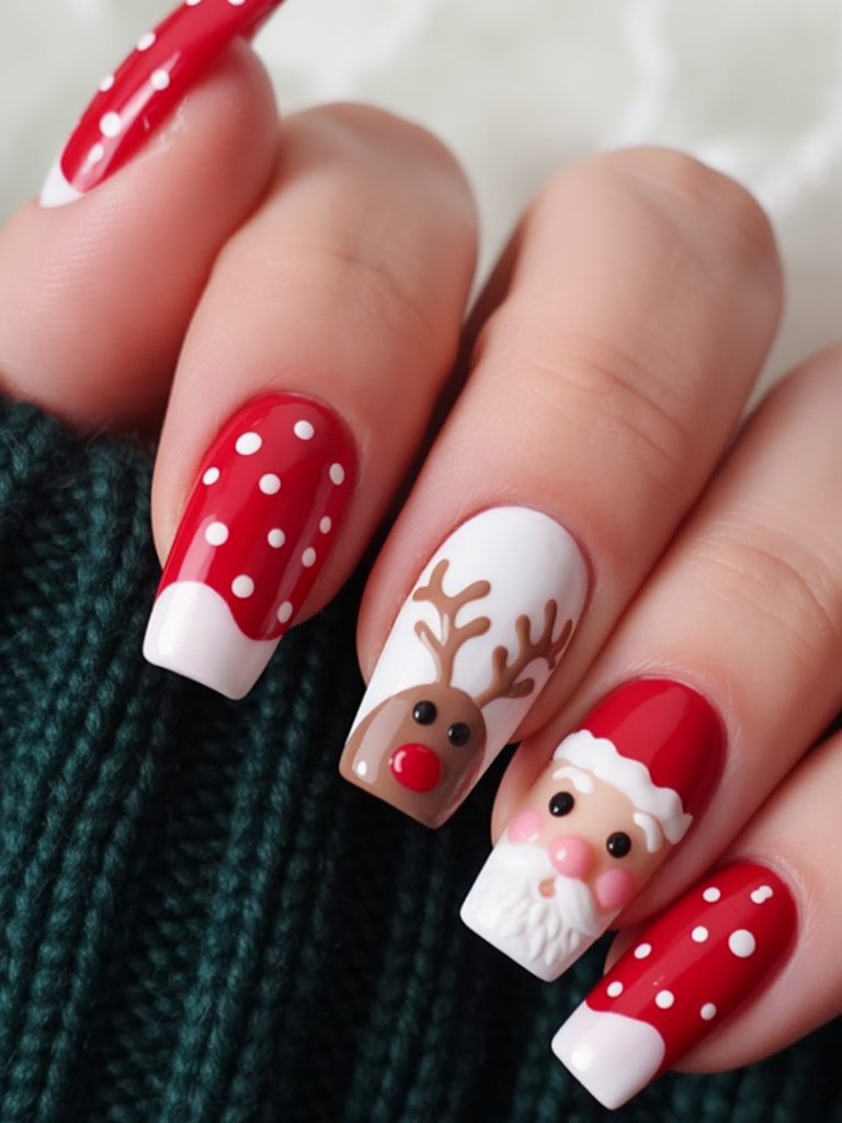 This manicure brings back magical childhood memories of Christmas with whimsical faces of Santa and reindeer. Red-and-white polka dots make for a playful touch, while the crisp French tips maintain the sophistication. This delightful, nostalgic design is guaranteed to make you smile every time you catch sight of your hands.