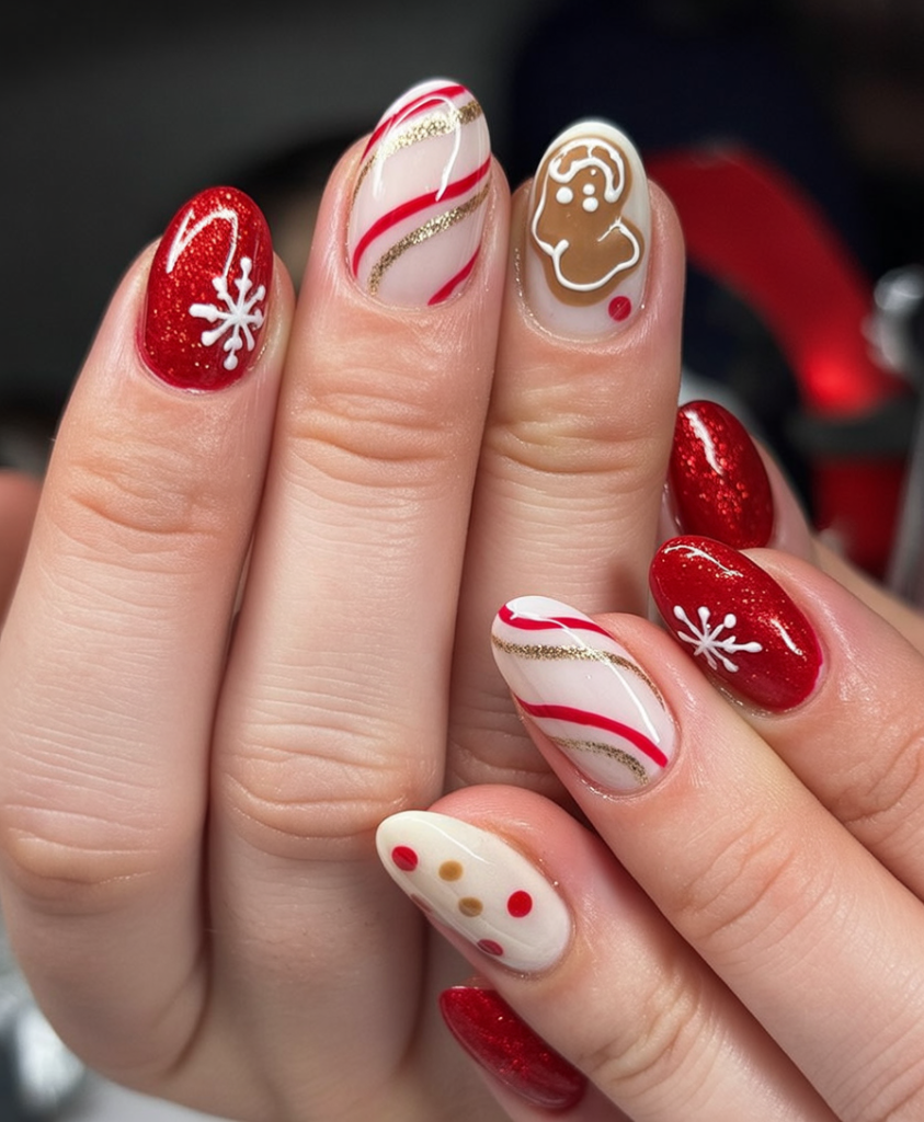 These nails stand for pure merriment with red glitter, candy cane stripes, and the utmost adorable gingerbread man design. It is a manicure that brings a smile to your face every time you look at it: playful and polished at once. The touches of gold add glitz to make the design extra special, like those holiday goodies we wait for all year.