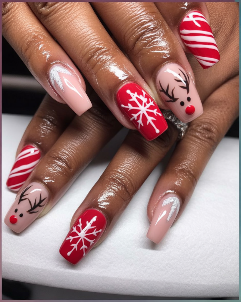 4. Classic Reindeer and Snowflake Square Christmas Nails