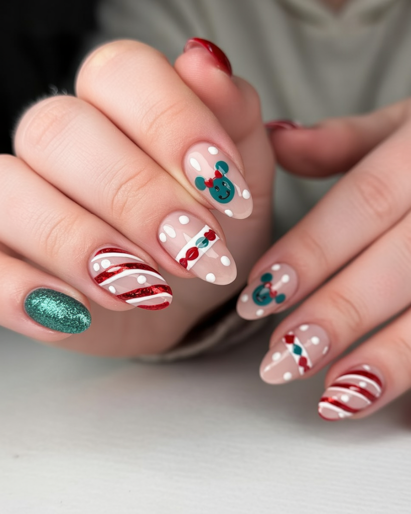 These nails are the spirit of Christmas with a Disney-inspired break, featuring bright candy cane stripes, snowflakes with dots, and cheesy cartoon accents. The glitters of greenude heighten the festivity and bring in one more hue of holiday color. So much fun, so much imagination-one to keep if you admire designs that sprinkle some extra magic on the holidays.