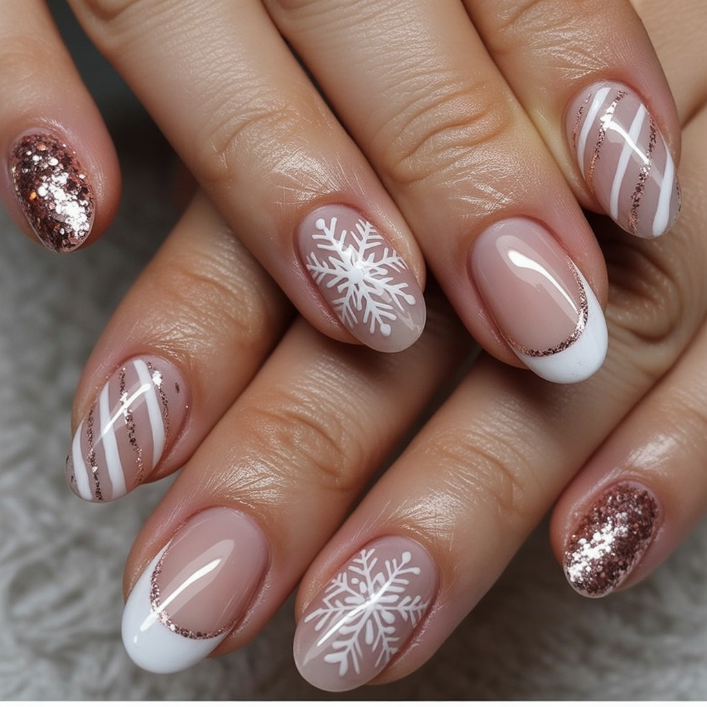 Elegant rose gold glitter allows this manicure to shine through with holiday cheer, which is then accompanied by delicate candy cane stripes and ornate white snowflakes. The nude base keeps everything muted and classy; detail on glitter tips and French-style adds an air of elegance. This kind of look is at once festive and timeless, perfect for dining out at holiday dinners or at a lazing Christmas party.
