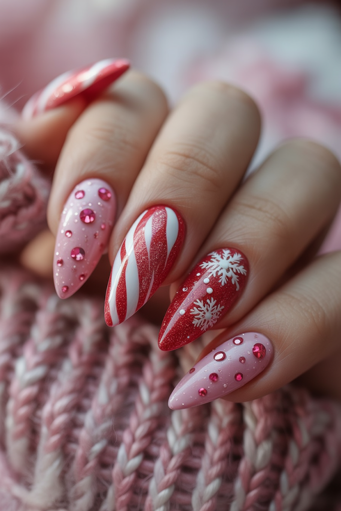 7. Sparkly Pink and Red Candy Cane Christmas Nails