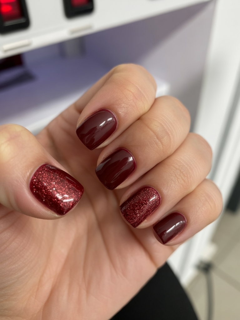 The result of red and shimmer combination is this tasty-looking, holiday-feeling manicure: holiday time itself arrived at an early date. The combination of deep red and mild glitter is just right in case somebody needs a blend of little glimmer without looking like a sequin piece. It’s bold, elegant, and gives just enough dazzle to keep things interesting.