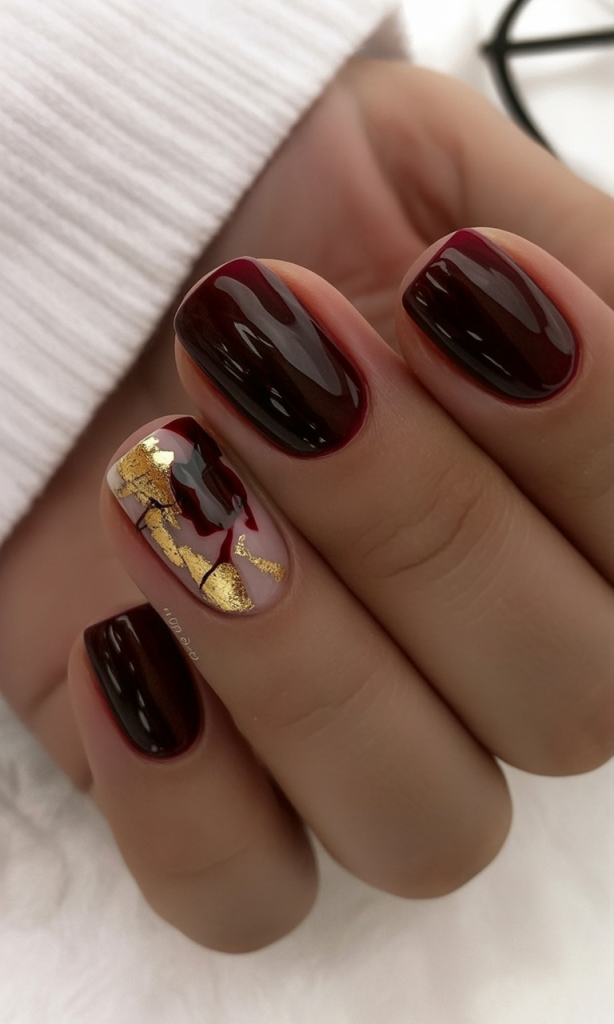 It is a wearable art manicure — red wine with a splash of shiny gold foil and an abstract painting-like design. It’s modern, moody, and a little luxe. Red wine and the fireplace are just waiting to surround these nails and steal the attention in your Instagram story.