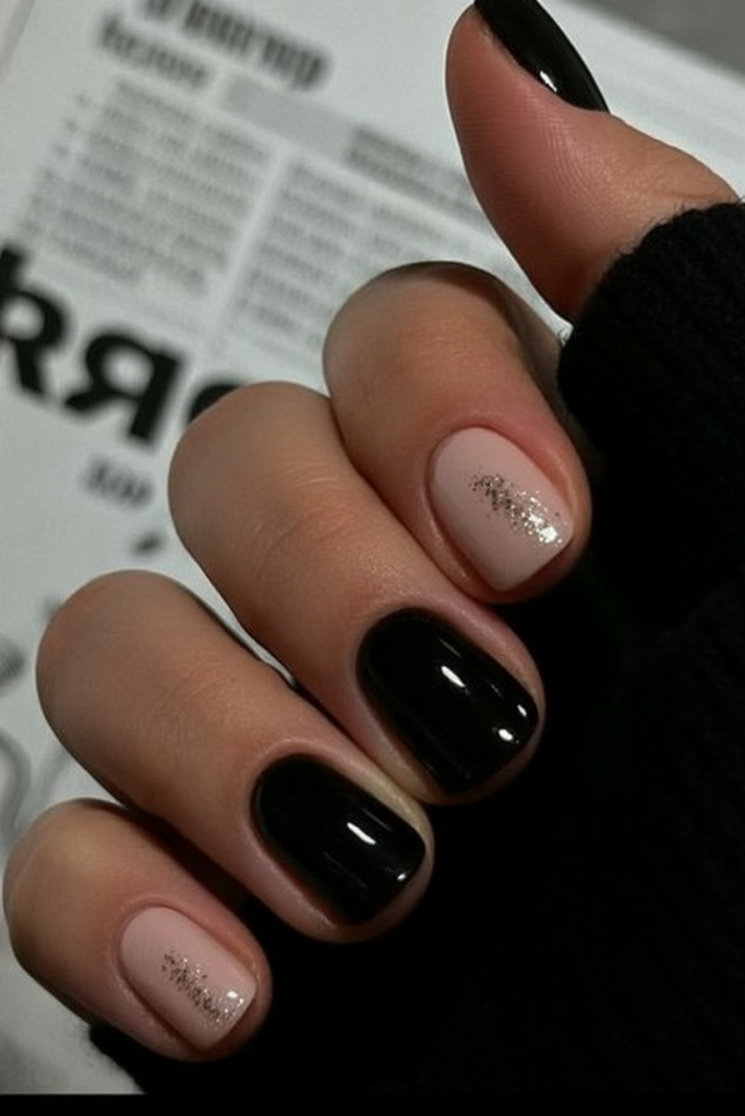It is so in-style chic to rock this minimal fall nail vibe. The shiny black is coupled with the blush nude and some strewn silver glitter, which is like downtown in an actual manicure. It is neat, refreshing and low-key and loud- with a power that is very suitable on boardroom or first dates.