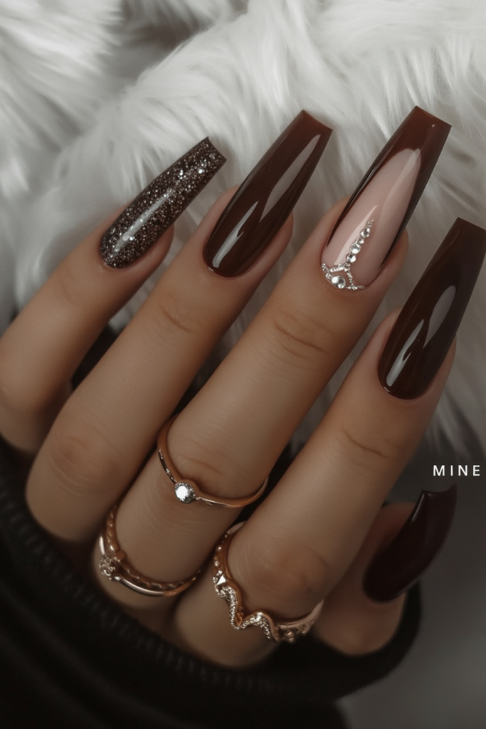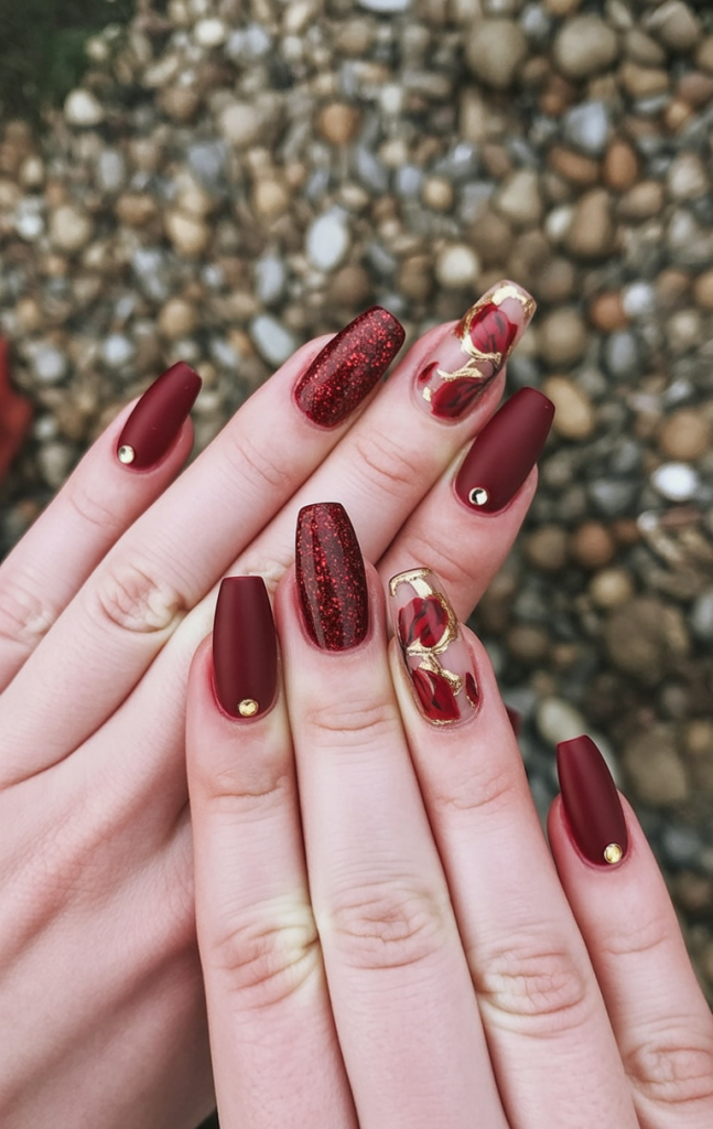 In case you enjoy the drama of fall bouquet and the finesse of red wine night, this design combines them both. The matte burgundy nails paired with glitter accents and gold-lined floral art feel romantic, rich, and ready for the season’s boldest looks.