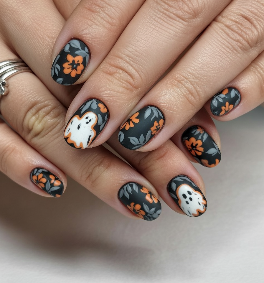 There is no need to think that Halloween nails must be cheesy and loud. This floral motif in a dark color combined with small and cute ghosts is beautiful, artistic, and completely wearable throughout October. The oranges colors of the flowers stand out against a matte black background with the addition of adorable little spirits in a manner that appears celebratory and luxe.