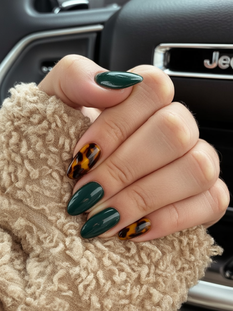 The design can be compared to walking into a fall rain forest, muddy, melancholic, and scrumptiously fashionable. The warm tortoiseshell nail decals on its accent nails are the perfect match with the deep green polish, which is a combination of nature and a top-to-bottom fashion choice. It’s the kind of combo that instantly levels up your outfit, even if you’re just wearing a chunky sweater and leggings.