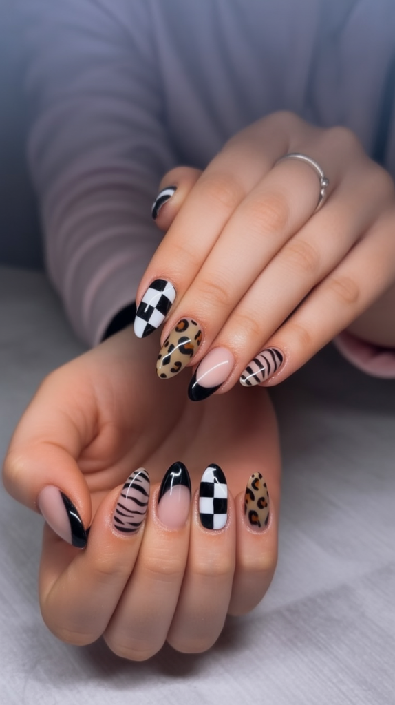 This is the design of the girl who likes a touch of everything fancy. Checkerboard, leopard, zebra and French tips are present in one harmonized but wild design which resembles a Pinterest mood board times ten. Nature but in proportion like fall fashion ought to be.