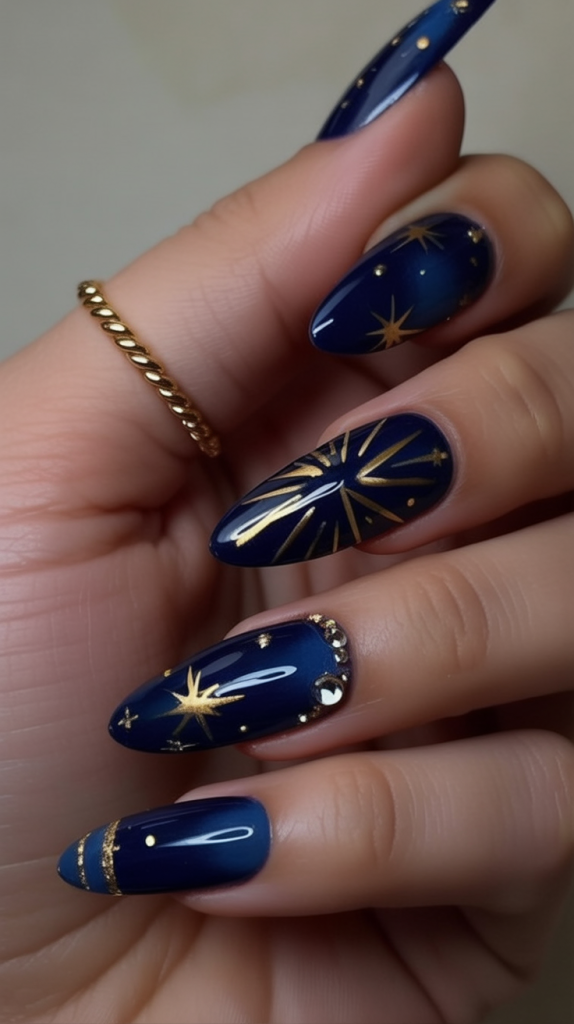 This shape is good because it has strength and stability, so it is great in the case of long nails that would have to stand numerous wearings. Combination of matte and gloss finishes ensures depth and artistic effects, whereas the gold foil elements make the whole design so unforgettable.