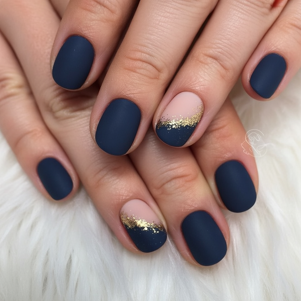 This matte navy manicure is your favorite cuddly coat elegant, modest and ready to be layered. The glitter touch of gold along the tips is not too much so that the design turns easy to put a festive touch to it.