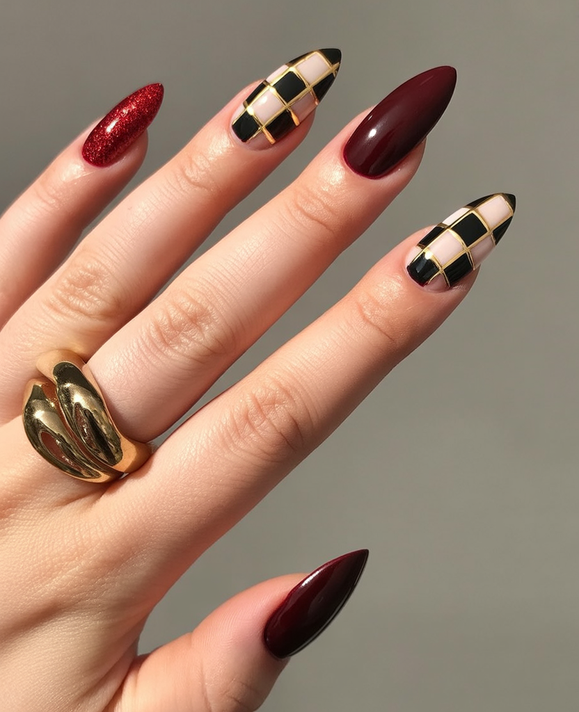 This is a high-fashion interpretation of fall nails using a deep burgundy nail polish combined with a black-and-nude plaid grid pattern embedded in gold. It is preppy with a twist of glamour and it seems you just got your hands on an autumn runway chic.