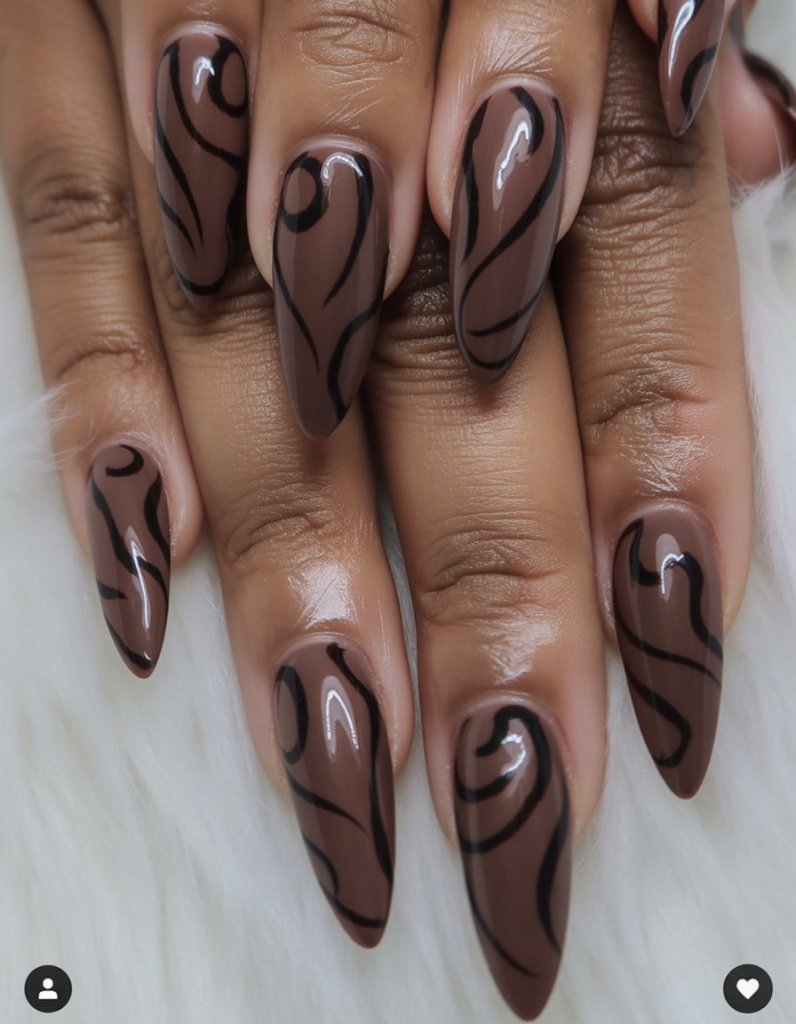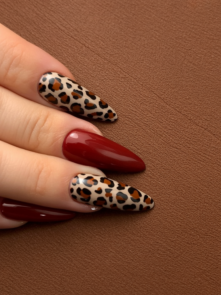 Who says dark fall nails can’t have a little wild side? These wild leopard print details are offset with smooth and burgundy designs almond which gives off confidence and mystery. It’s playful yet polished, making it a fabulous pick for anyone who wants to break out of their neutral comfort zone this season.