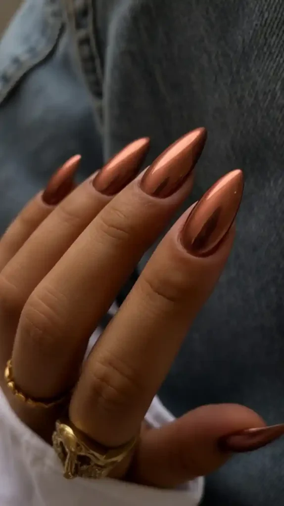 These nails are copper-like molten nails shiny, smooth and flashing. They are also glowingly bright with their chrome finish that will warm your fall wardrobe with every hand movement. It is an equivalent of a secret weapon of glam that reflects the light in just the correct manner.