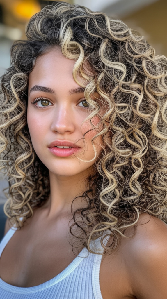 Carrying a dirty blonde, the bouncy curls are given along with blonde streaks to give more energy and personalisation to the hair style. The dark roots hold a contrast to lighter curls, so each ringlet stands out, creating an effect of playfulness and radiance. It’s joyful, lively, and undeniably confident.