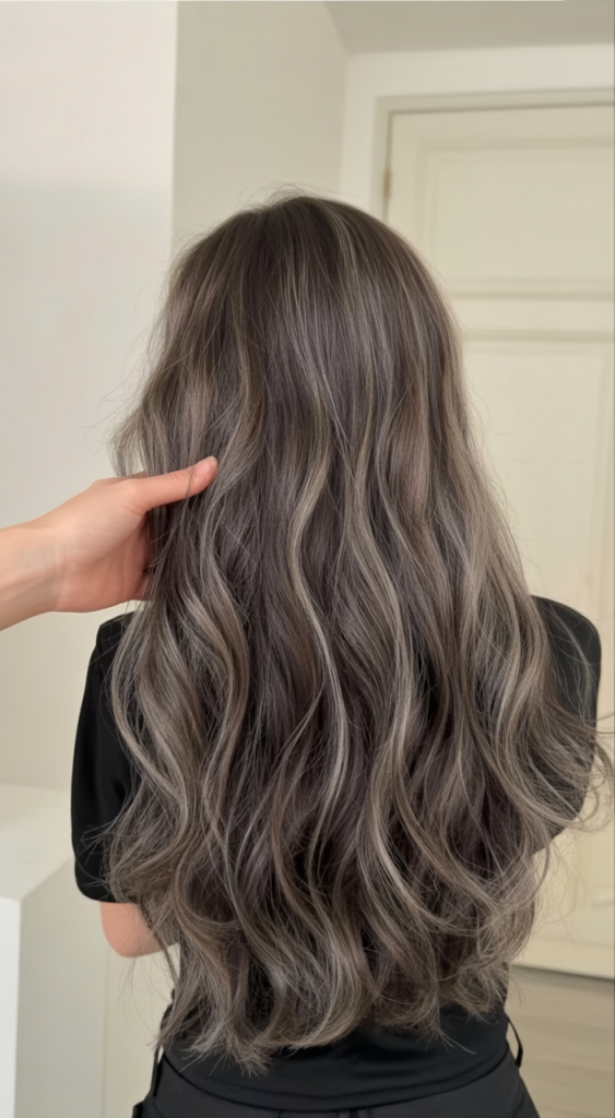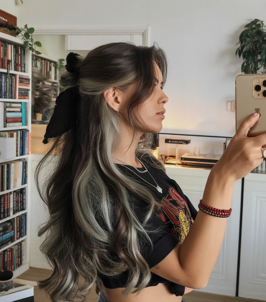 The vibe here is unapologetically creative. Need that edge, but do not want to commit to bright color? It is a stunning alternative in 2025. The deeper foundation brings out the blue and ashy segments, and therefore, is ideal when the brunette is experimenting with blonde highlights and lowlights. It looks best with soft curls that helps to highlight those layers of color, which creates that cool and confident vibe that can turn heads.
