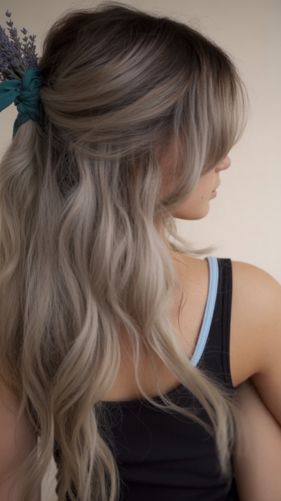 This half up-do is romantic and feminine with the ashy blonde highlights that reflect light. The smooth color gradation contributes soft texture of the flow making it to be a type of look that is feminine yet not overstaged. It is casual, fun and with a hint of sophistication.